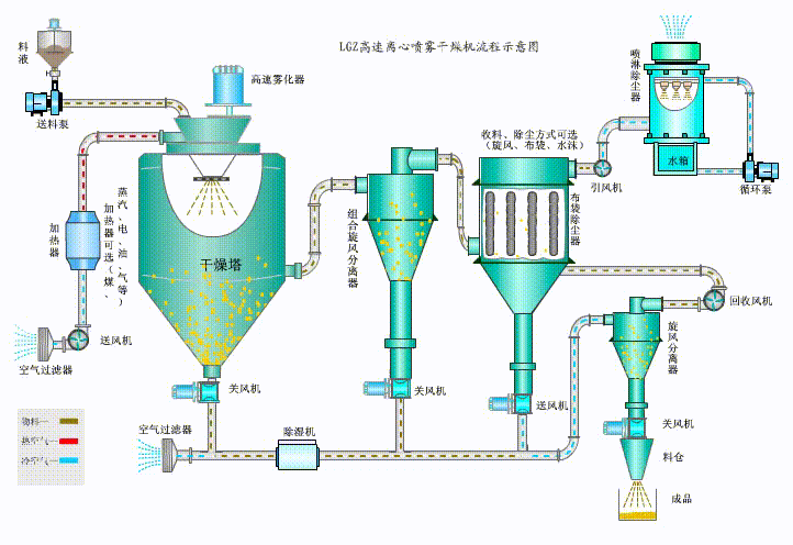 離心噴霧干燥機(jī)即是利用離心式霧化器將某些液體物料進(jìn)行干燥,是目前工業(yè)生產(chǎn)中使用普遍的干燥機(jī)之一。噴霧干燥機(jī)是液體工藝成形和干燥工業(yè)中普遍應(yīng)用的工藝,適用于溶液、乳液、懸浮液和可泵性糊狀液體原料中生成粉狀、顆粒狀產(chǎn)品。因此當(dāng)顆粒大小分布、殘留水分含量、堆積密度和顆粒形狀符合準(zhǔn)確的標(biāo)準(zhǔn)時(shí)噴霧干燥機(jī)是一道合適的工藝。它的工作原理是:空氣通過過濾器和加熱器,進(jìn)入離心噴霧干燥機(jī)頂部的空氣分配器,熱空氣呈螺旋狀均勻進(jìn)入干燥器。料液由料液槽經(jīng)過濾器由泵送至干燥器頂部的離心霧化器,使料液噴成小的霧狀液滴,料液和熱空氣并流接觸,水分迅速蒸發(fā),在短時(shí)間內(nèi)干燥成成品,成品由干燥塔底部和旋風(fēng)分離器排出,廢氣由風(fēng)機(jī)排出。